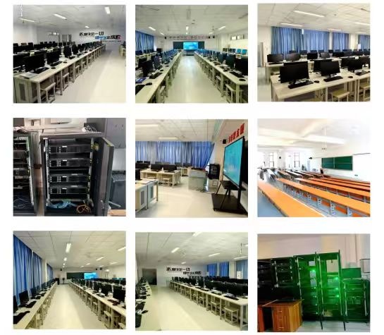 校内实训基地,打造了集实训、教学、创新于一体的现代化平台。2间百万实训机房,配备200台戴尔品牌机,2台教师机,4台华为服务器,6台交换机,1台企业级路由器,2个光模块,2台IDC机柜。同时还搭建AIGC数字化工程实践课程平台。每间实训室均配备1台86寸一体机大屏、2台美的空调、1套音箱及话筒。