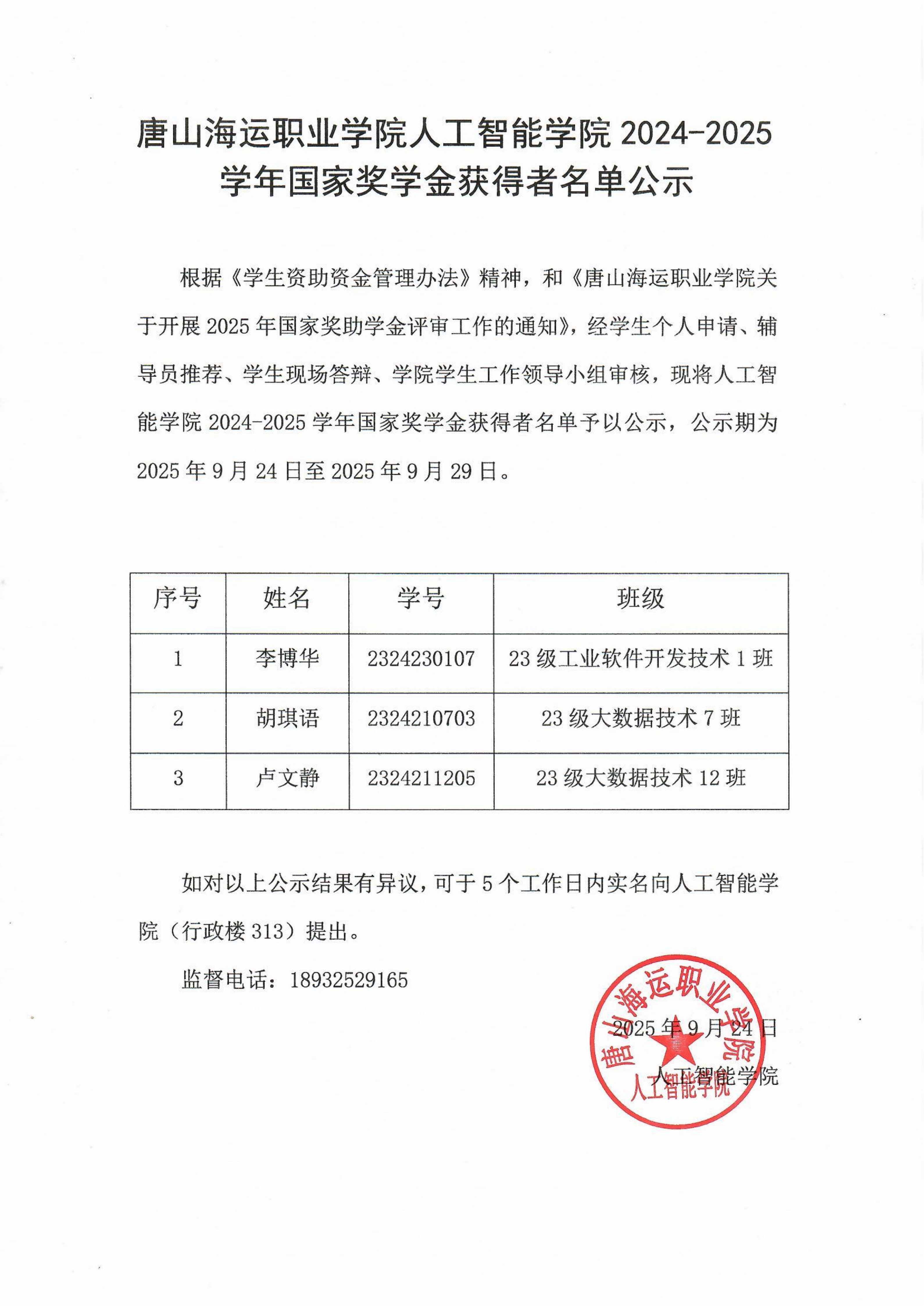 唐山海运职业学院人工智能学院2024-2025 学年国家奖学金获得者名单公示