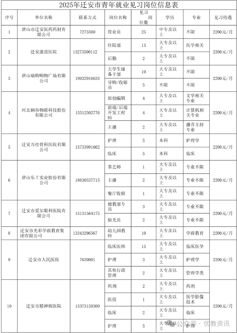 按照迁安市人力资源和社会保障局《关于做好2025年青年就业见习有关工作的通知》(迁人社字[2025]28号)文件要求,2025年我市现有10家单位124个岗位申请就业见习,见习期限为9个月。现就做好就业见习报名工作有关事宜通知如下: